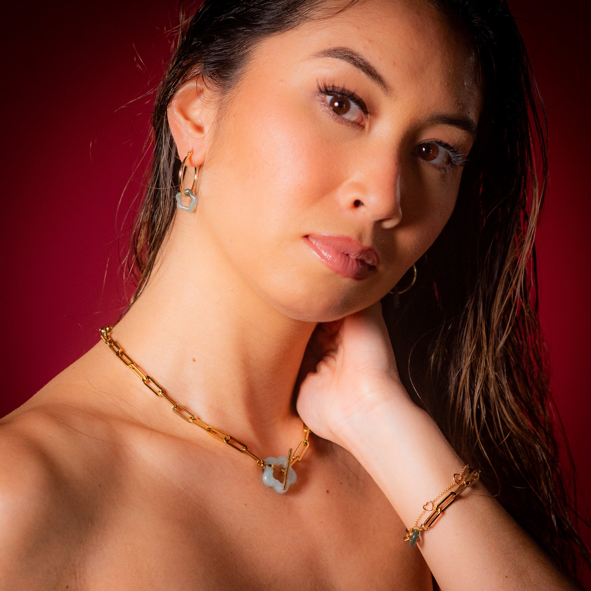 The flower-shaped pendant is carved from authentic Grade A Burmese jade and paired with a subtle toggle. Set in surgical-grade 316 stainless steel and plated in radiant 14k yellow gold, it brings lasting elegance to your everyday look.