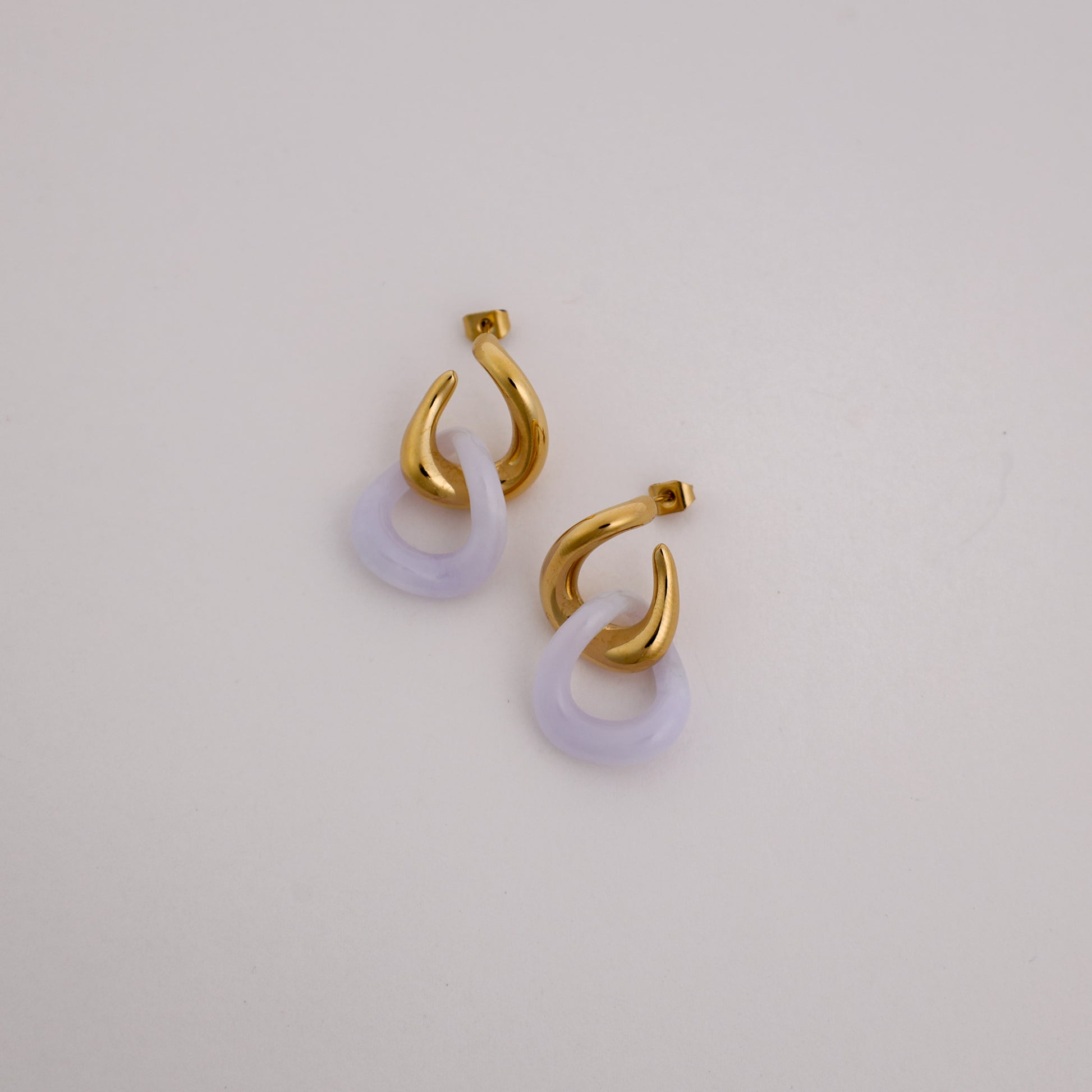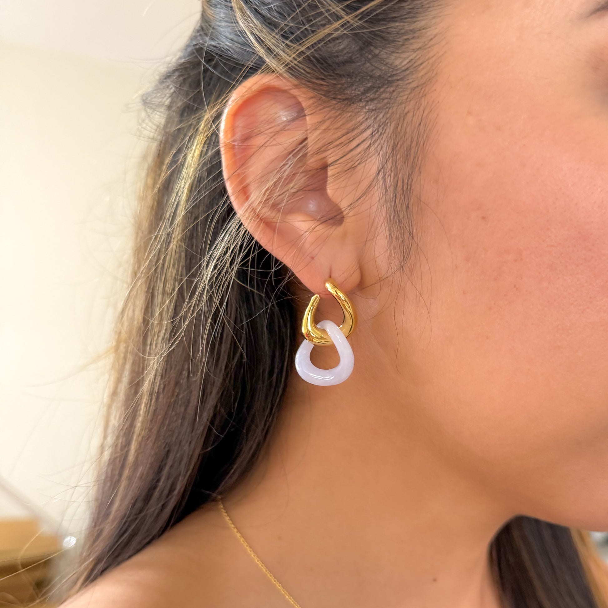 The Twist of Fate Earrings honor those unexpected moments that shape us, with interlocking curves of radiant gold and green or lavender jade.